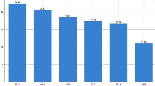 而令不少投资者较为看重的净资产收益率也呈现不断下滑状态,直至混改全面完成的2019年,跌破15%。