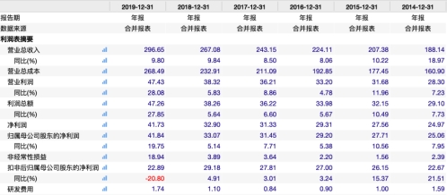 年报显示,2019年云南白药实现营业收入296.65亿元,同比增长9.80%;实现归母净利润41.84亿元,同比增长19.75%;实现扣非后归母净利润22.89亿元,同比下滑20.80%。