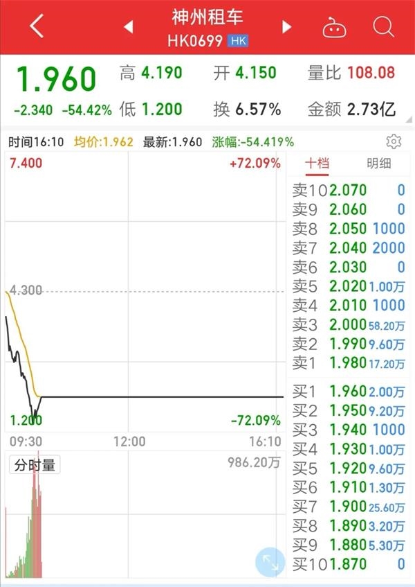 4月3日,陆正耀为瑞幸咖啡和神州优车的实际控股人、投资人,在港股上市的神州租车开盘后不久便暴跌70%,直接导致神州租车在上午10时许开始采取紧急停牌措施,同时,与神州租车有关的所有结构性产品也暂停交易。截至今日收盘,神州租车仍未开盘,停牌前股价定格在1.96港元,跌幅为54.42%,市值缩水近50亿港元(折合人民币超45亿元)。