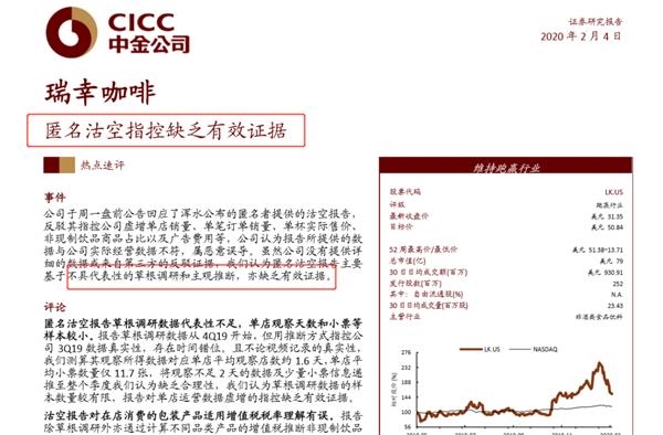 中金公司是瑞幸上市的主承销商之一,此前也参与过瑞幸融资;在浑水发布做空报告时,中金公司曾认为,沽空报告主要基于不具代表性的草根调研和主观推断,亦缺乏有效证据。