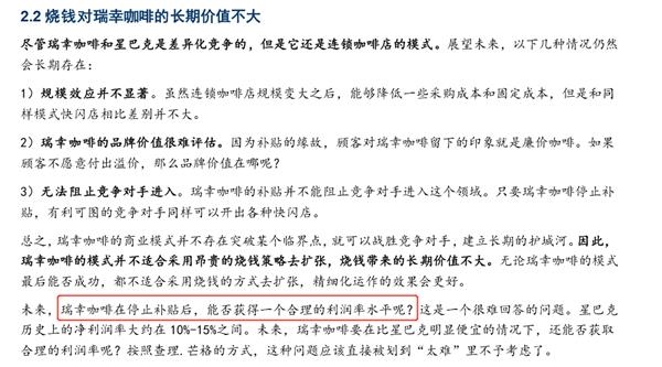 东兴证券相对谨慎,对其烧钱扩张的商业模式存疑。在其2019年12月底的研报中认为,瑞幸咖啡通过烧钱去做闪电式扩张的长期价值不大。