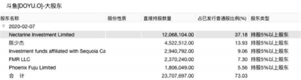 据披露,斗鱼截至2月7日,公司占股比例最大的为腾讯全资子公司Nectarine Investment Limited,持股比例为37.18%,为最大股东;斗鱼创始人兼CEO陈少杰持股为13.93%。