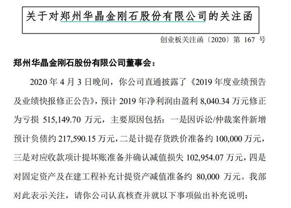 对于豫金刚石业绩突然变脸,深交所也紧急下发关注函,要求对计提负债、跌价和减值等情况进行补充说明,是否符合会计准备、高管是否勤勉尽责、计提的坏账具体是哪些坏账、计提跌价是否准确真实、是否存在挪用募集资金等。