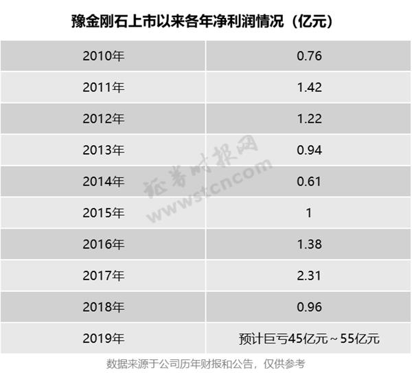公告显示,修正后,公司预计2019年将亏损高达45亿元~55亿元。在此前的业绩预告中,公司预计2019年度盈利为6743.80万元~9634.00万元,这意味着,豫金刚石净利润向下修正了超过40亿元,幅度之大令人咋舌。