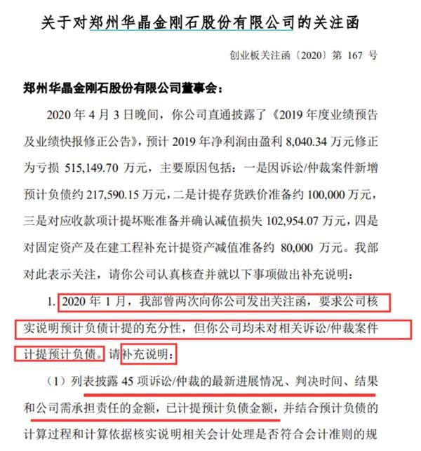 深交所创业板公司管理部下发的关注函指出,2020 年 1 月,该部曾两次向豫金刚石发出关注函,要求公司核实说明预计负债计提的充分性,但公司均未对相关诉讼/仲裁案件计提预计负债。