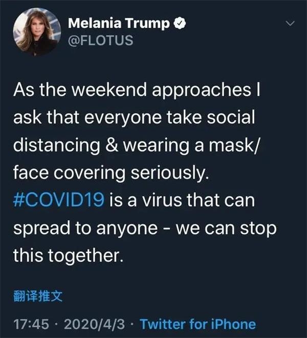 美国CDC更新最新防疫指南的同时,美国第一夫人梅拉尼娅·特朗普3日也通过社交媒体呼吁人们佩戴口罩。