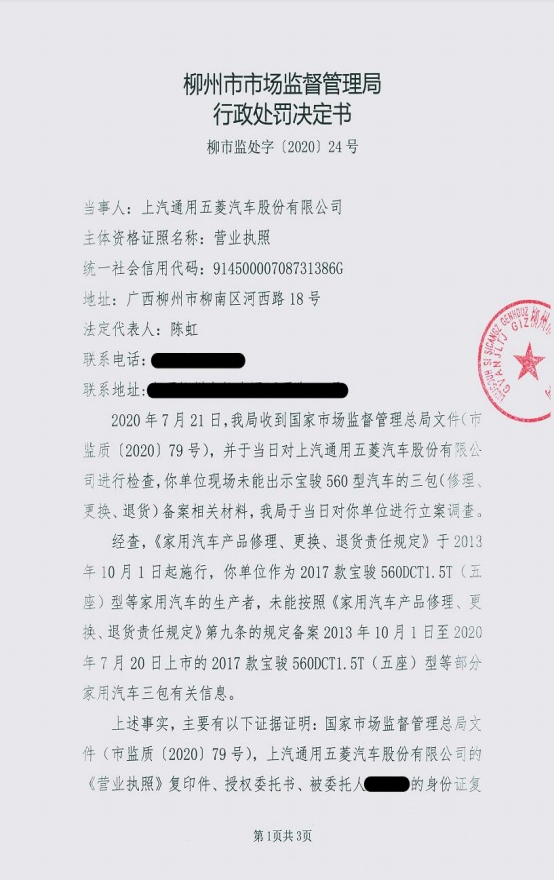 8月26日,中国消费者报记者从广西柳州市场监管局网站获悉:上汽通用五菱汽车股份有限公司因违反汽车三包备案制度被广西柳州市市场监管局处以警告并顶格罚款3万元。