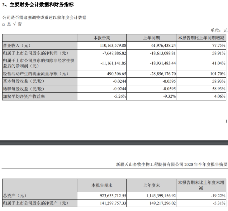 天山生物半年报:上半年净利润亏损765万元,上年同期亏损1861万元。