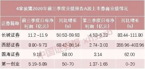 数据显示,截至10月16日19:00,第一创业、长城证券、西部证券、国海证券均已披露了业绩预告。