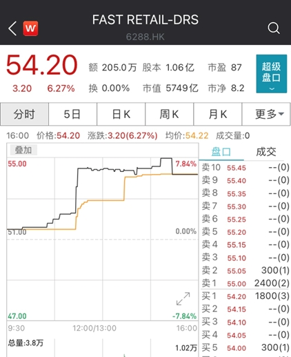 受消息影响,昨日迅销(6288.HK)复牌后表现强势,截至收盘,报54.2港元,涨6.27%,最新总市值为5749亿港元。