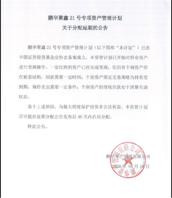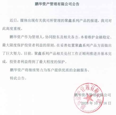 值得一提的是,对产品违约一事,鹏华资产10月16日发布公告表示,鹏华资产作为管理人,协同股东和相关各方,本着金融稳定、最大限度保护投资者利益的原则,在妥善处置聚鑫产品方面做出巨大努力,目前聚鑫产品的兑付工作正顺利推进,并已基本完成,投资者利益已得到最大程度的保护。