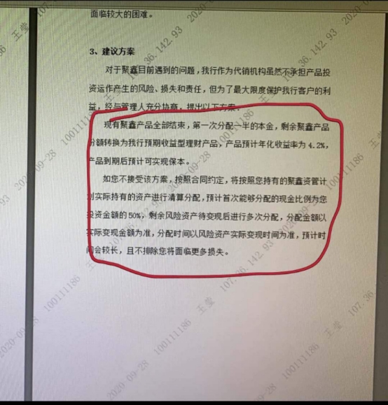 该建议方案表示,虽然工商银行作为代销机构并不承担产品投资运作产生的风险和、损失和责任,但为了最大限度保护工行客户的利益,工商银行提出先兑付50%的本金给投资者,剩余金额转换为工商银行的理财产品,封闭期一年,一年后兑付剩余的50%。