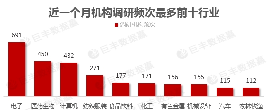 进一步从被调研标的来看,共有292家上市公司被机构投资者调研。根据巨丰财经的数据显示,近一个月内,电子行业是机构调研最为频繁的行业,调研次数多达691次,而具有“抗疫”属性的医药生物板块则次之,被调研的次数为450次,计算机板块则被调研432次。这样看来,科技股仍是机构投资者近期青睐的对象。