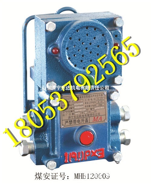 该产品集打点按钮、防爆灯、防爆电铃、三通接线盒为一体,隔爆接线腔内设打点按钮,并有三个出线口,取代了打点按钮和三通接线盒,用高亮发光二极管和矿用防潮扬声器取代了防爆灯和隔爆电铃。通过电源连线实现载波对讲通讯。