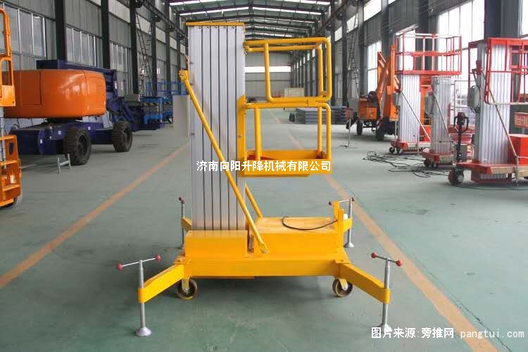 单组高强度铝合金升降机,整机重量轻,机动性好,适合单人操作;特制的桅柱间导轮装置升降平稳自如;结构紧凑,运输状态尺寸小,可进入一般电梯的轿厢以及能顺利通过门洞和狭小通道;双重保护的支腿结构,工作更安全,且可贴近工作面升降作业。铝合金升降机,采用优质铝合金原材料构成,具有造型优美、质量轻盈、体积小的优点,可在狭小的空间里完成高空作业。该机为室内型,操作简单、移动方便,一人即可完成高空作业。广泛适用于会所、展厅等地,是更换灯具、高空清洁的好帮手。
