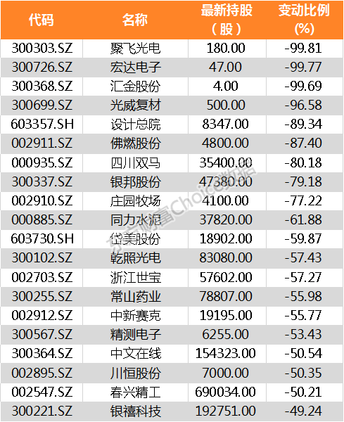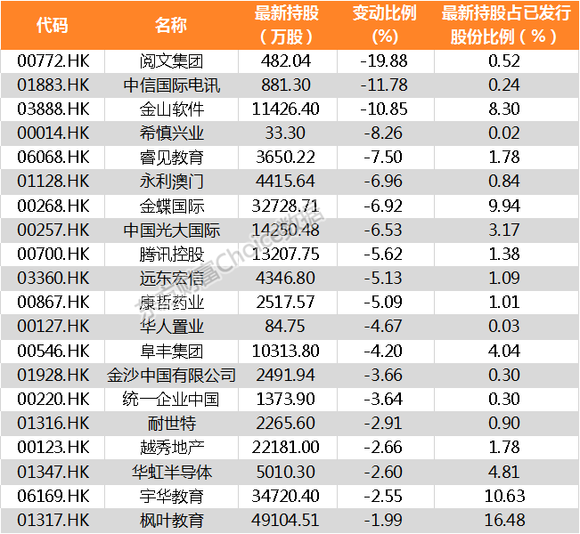 南向资金减持股份占其持股比例前20家公司名单:
