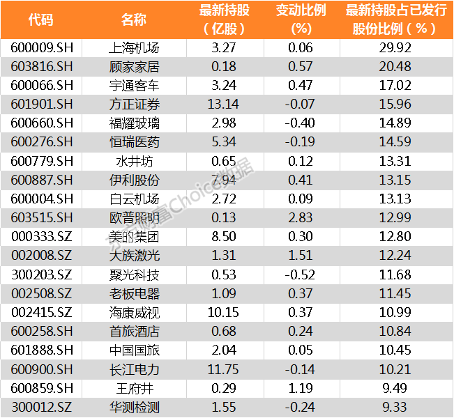 最新北上资金持股比例前20家公司名单: