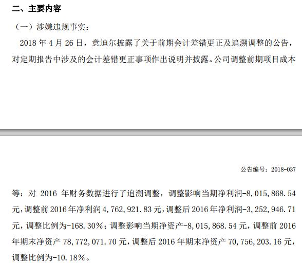 2018年4月26日,意迪尔披露了关于前期会计差错更正及追溯调整的公告, 对定期报告中涉及的会计差错更正事项作出说明并披露,公司调整前期项目成本等。