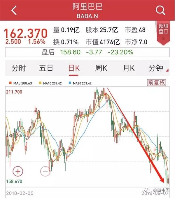 从阿里巴巴股价表现来看,自今年6月份以来,股价持续回落。三个月时间,阿里股价从211.7美元高点跌落至如今的162.37美元,跌幅高达23.3%,市值蒸发约1269亿美元,折合人民币约8682亿元。