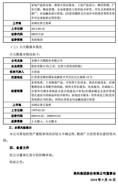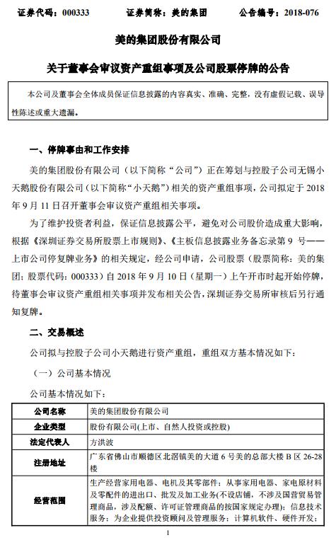 美的集团(000333)9月9日晚间公告,公司正在筹划与控股子公司小天鹅(000418)相关的资产重组事项,公司拟定于9月11日召开董事会审议资产重组相关事项。公司股票将于9月10日起停牌。
