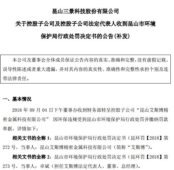 9月10日消息,新三板挂牌企业三景科技(430393) 子公司艾斯博未通过环保“三同时”验收开工生产,艾斯博和法人代表卓斌被昆山市环境保护局处罚。