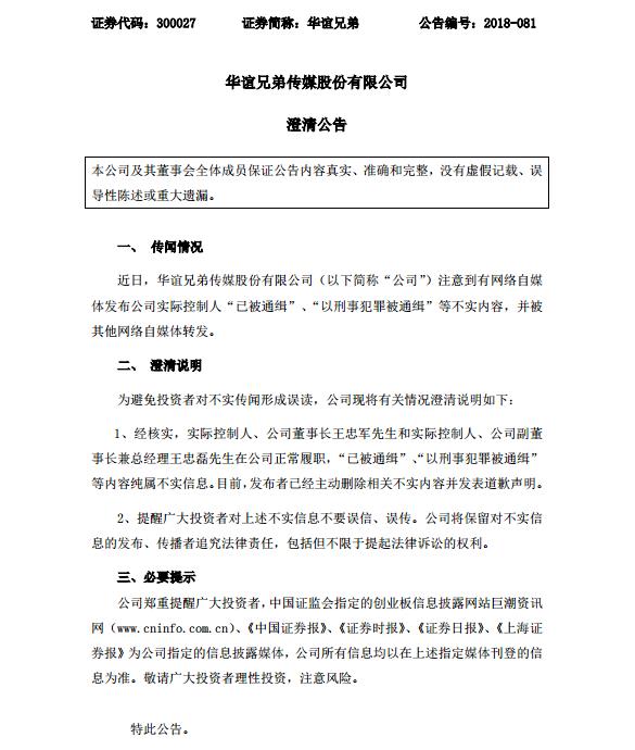 华谊兄弟(300027)9月10日晚间发布澄清公告称,经核实,实际控制人、公司董事长王忠军先生和实际控制人、公司副董事长兼总经理王忠磊先生在公司正常履职,“已被通缉”、“以刑事犯罪被通缉”等内容纯属不实信息。目前,发布者已经主动删除相关不实内容并发表道歉声明。