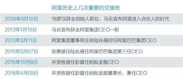 这期间,阿里巴巴的CEO经历了几次更替:2013年3月,阿里集团董事局任命陆兆禧接棒马云;2015年5月,这个位置交到了张勇手里;2016年10月,井贤栋接任彭蕾任蚂蚁金服CEO,马云则继续担任阿里集团董事局主席。