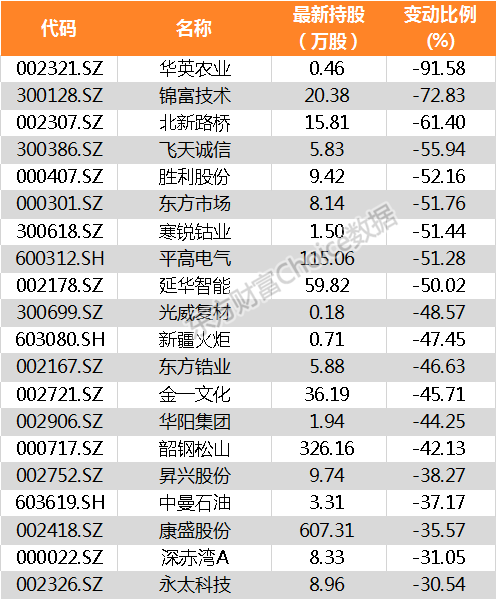 昨日,北向资金大幅减持的股票有华英农业和锦富技术等,其中华英农业减持比例达91.58%。