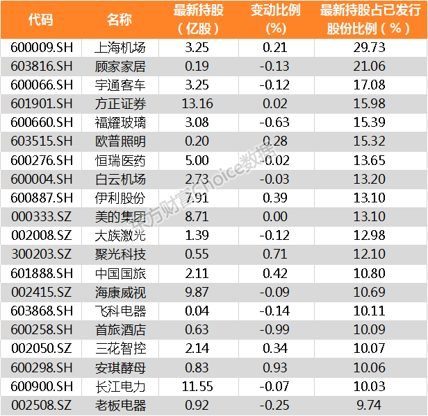 最新北上资金持股比例前20家公司名单:
