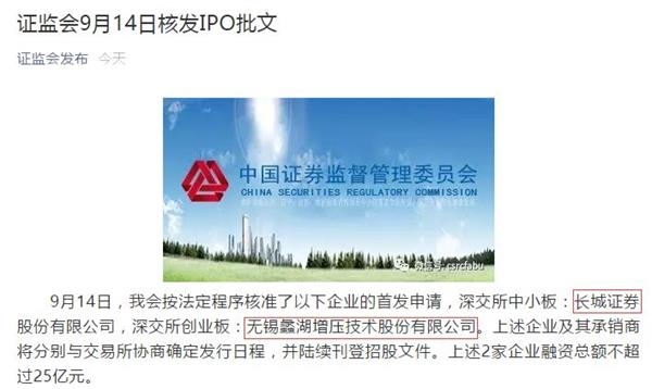 9月14日,证监会核准了长城证券股份有限公司、无锡蠡湖增压技术股份有限公司2家企业的首发申请,筹资总额不超过25亿元。